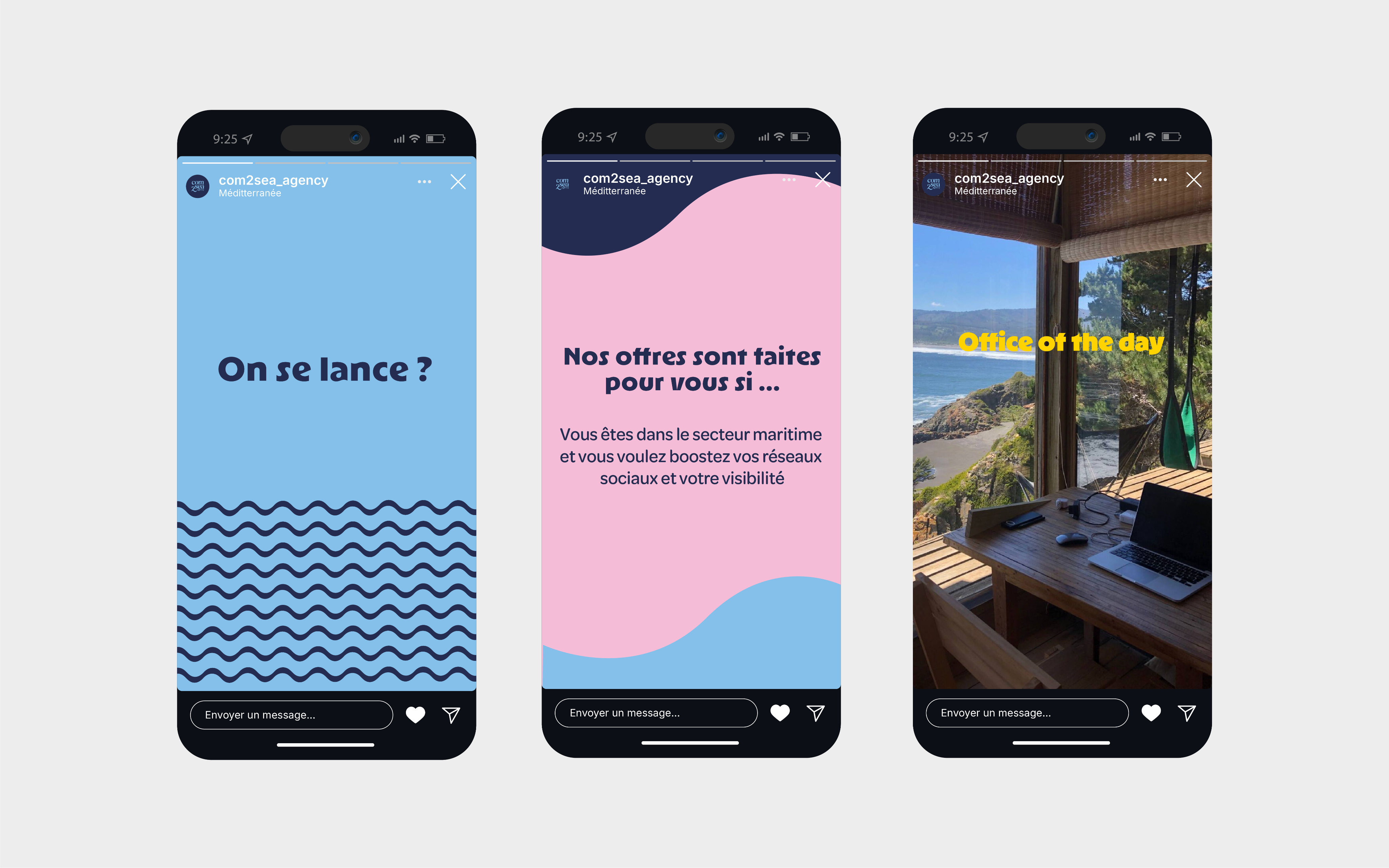 Com2sea is a communications agency specializing in the maritime sector. Its visual universe is inspired by the Mediterranean, with sunny imagery and a luminous atmosphere, united by a central element: the sea.