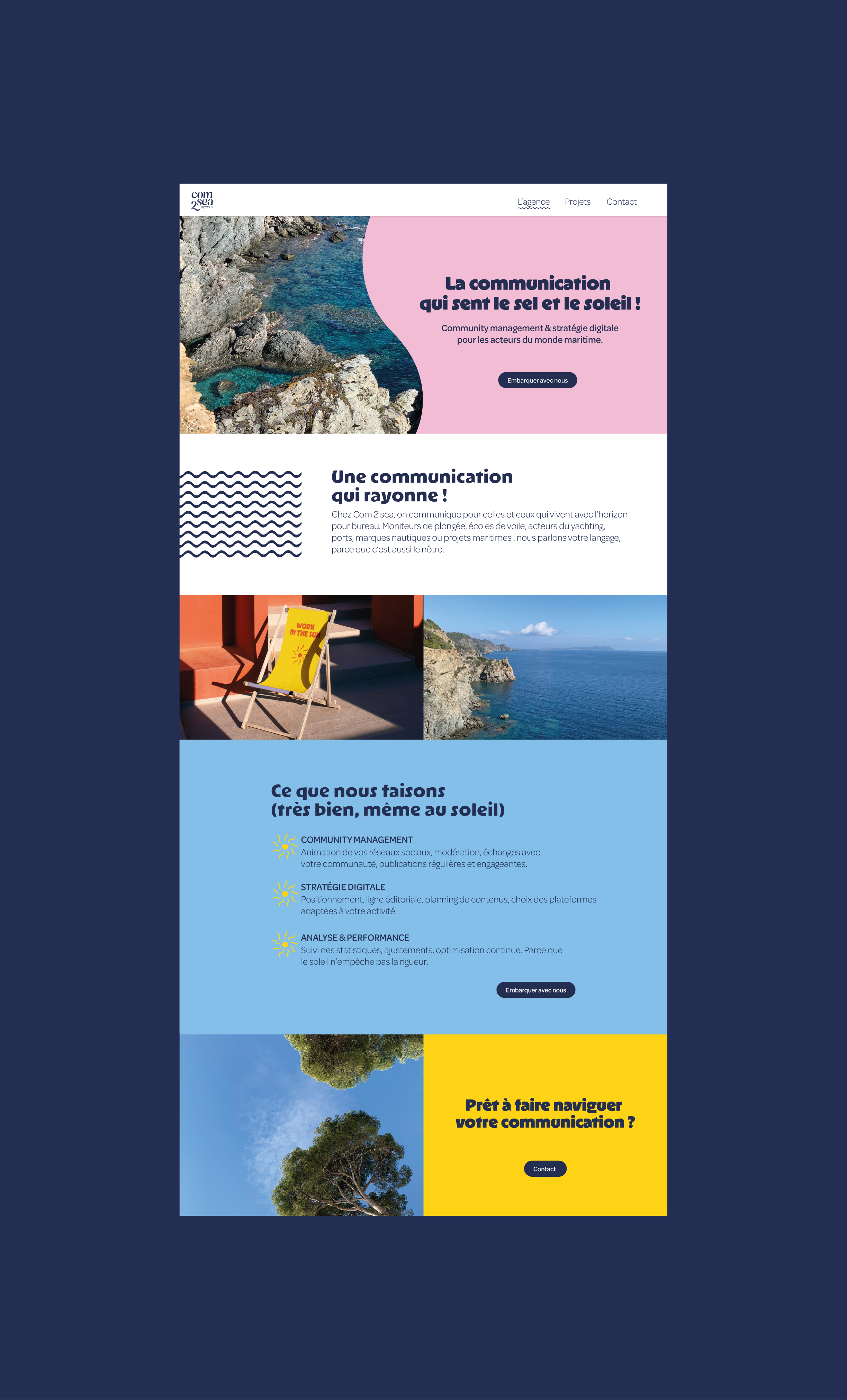 Com2sea est une agence de communication spécialisée dans les acteurs du milieu maritime. Son univers visuel s’inspire de la Méditerranée, à travers une iconographie ensoleillée et une atmosphère lumineuse, fédérée par un élément central : la mer.